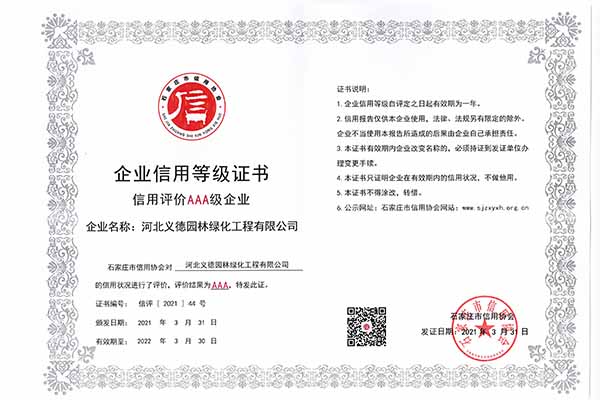 近幾年來我公司被授予2019年-2022年河北省扶貧龍頭企業(yè)、2018年國家林業(yè)標(biāo)準(zhǔn)化示范企業(yè)、2019年度全國苗圃50強(qiáng)、2018-2019年度河北省林業(yè)重點(diǎn)龍頭企業(yè)、2018年保定市精品特色現(xiàn)代農(nóng)業(yè)園區(qū)、2018年度保定林木種苗協(xié)會(huì)授予特色苗圃、2018年度北方十佳特色苗圃、2016-2019年河北省建設(shè)工程招標(biāo)投標(biāo)誠實(shí)守信5A級(jí)施工企業(yè)等榮譽(yù)稱號(hào),2017年保定市林木種苗龍頭企業(yè)、石家莊市2017年度優(yōu)秀園林企業(yè)。